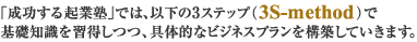 第三段階では、ビジネスモデルを基にして、ビジネスプラン(=事業計画)を作成します。単なる数値計画ではなく、「何から始めるか」まで行動を特定し、確実にスタートアップできるように計画を策定します。